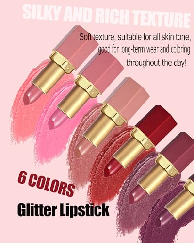 6Pcs Glitter Shimmer Lipstick - Experience the magic of Shimmering Lipstick, which is packed with dense shimmering powders that shimmer with diamond-like luster, leaving your lips sparkling, waterproof and moisturized all day long. It comes in 6 bold, vibrant colors, each shimmering with diamond-like luster, creating a dazzling, shimmering effect with every application for your makeup needs for any occasion. Apply lightly for a sophisticated, glossy lip look, or thickly for a high sheen.