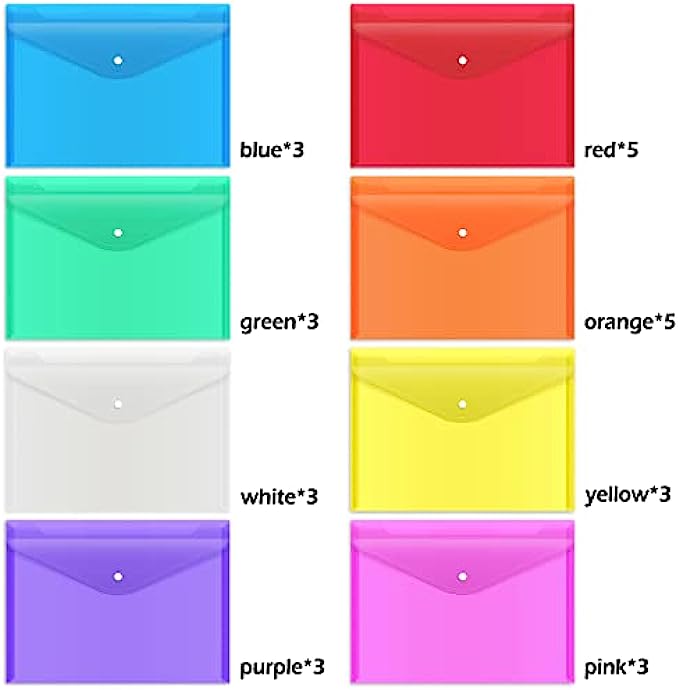 EOOUT 28pcs Plastic Envelopes, Plastic Folders, Plastic Envelopes with Snap Closure, Poly Folders, 8 Colors, A4 Size, Letter Size, for School and Office Supplies