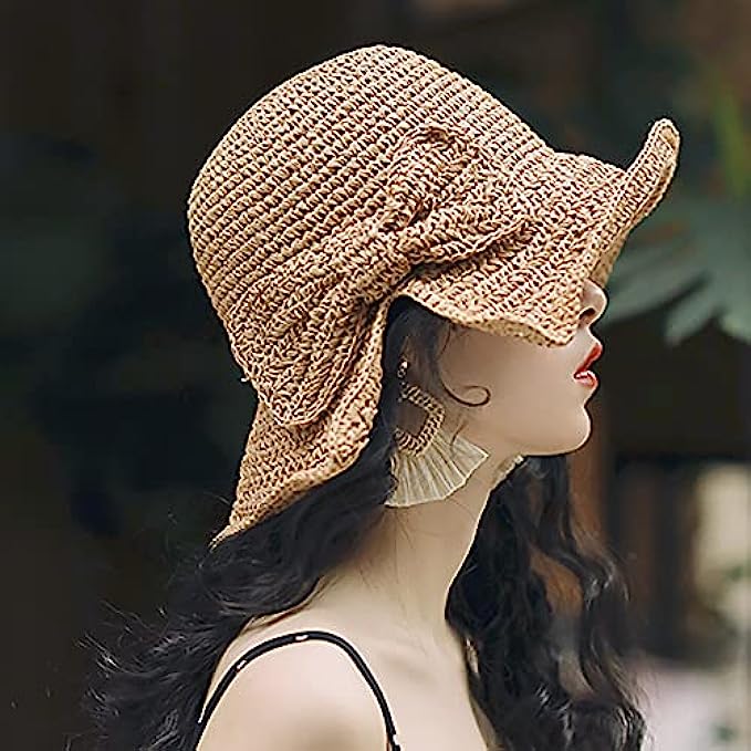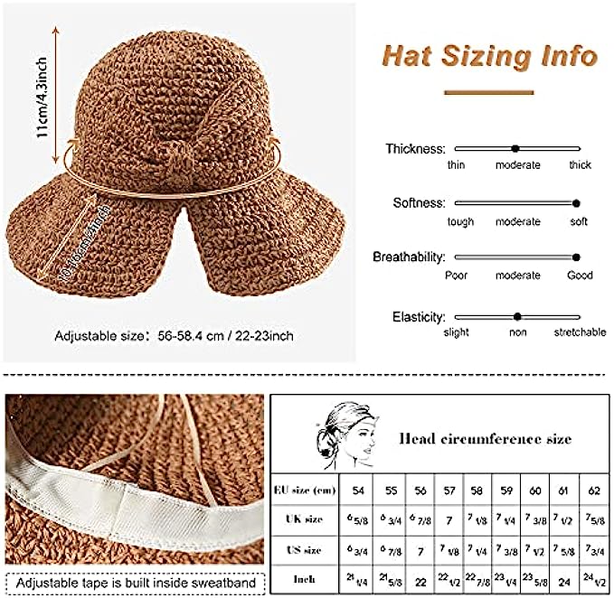Straw  拉绳 closure Hand Wash Only 【ADJUSTABLE STRAW SUN HAT】- Features with wicking sweat band to keep you cool and comfortable, prevent the sweat dripping in your eyes.Ribbon inside the sun hat can be adjusted for different head size,from small head size to large head size around 22.05-22.83 inches. 【USABLE】- Perfect to use as a beach hat for holidays or as a daily headwear, is very wearable with anything like dress, bikini or shorts for women lady teenagers girls. This sun hat is perfect for camping, hiking, gardening, traveling, fishing, boating, hunting, safari, beach, pool or any other outdoor sport activity. 【Big Wide Brim Beach Hat】- This Beach Straw Hat offer high UV UPF sun protection with full brim, sun blocker function.Wide Brim 4 inches helps to keep both of your head and neck from scorching sun.