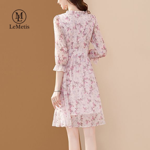 LeMetis Chiffon Floral Printed Dresses for Women 3/4 Sleeve Round-Neck Elegant Midi Dress