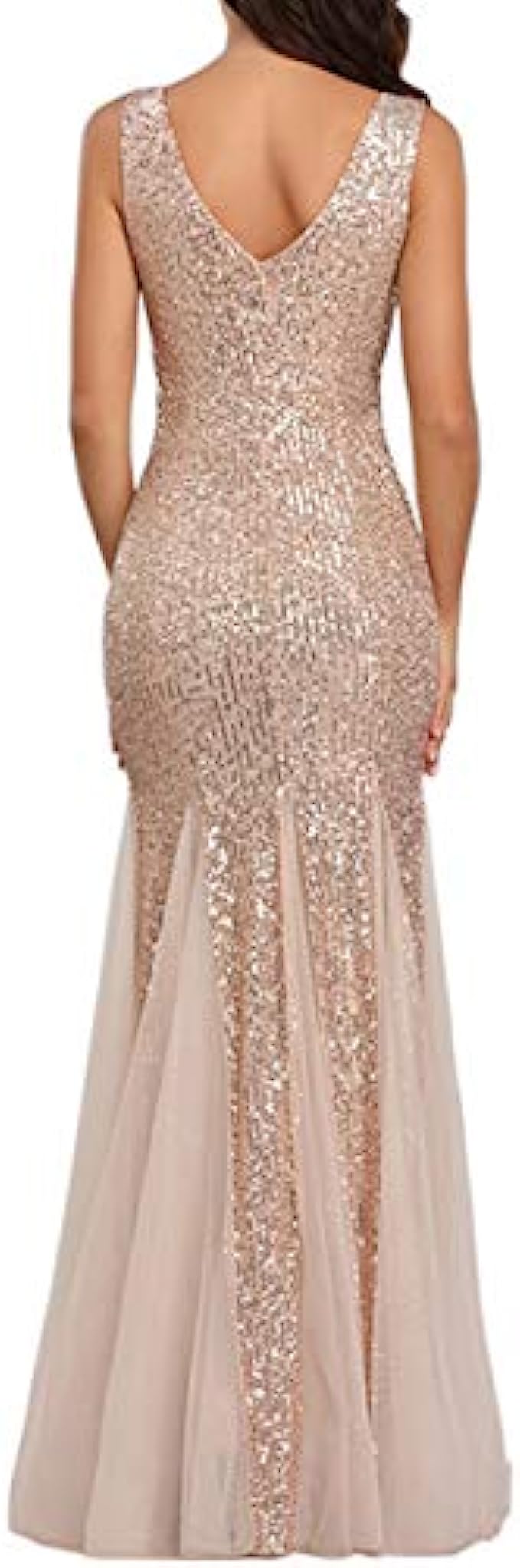 Womens Party Dress Sequins Tulle Sexy V-Neck Long Dress Sleeveless Formal Evening Prom Gowns