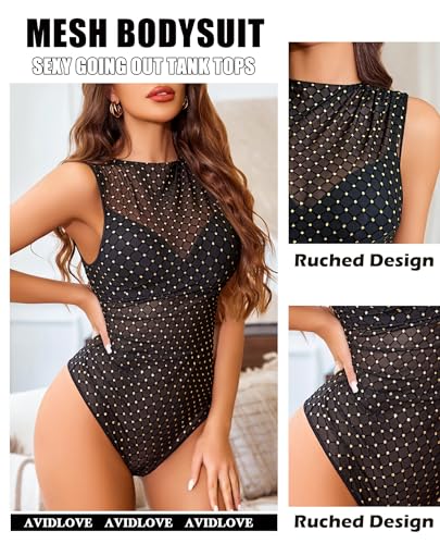 Avidlove Mesh Bodysuits for Women Mock Neck Sheer Sleeveless Shirts Ruched Going Out Tank Bodysuit Tops