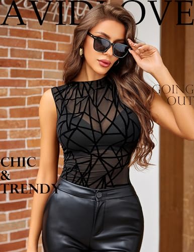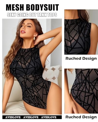 Avidlove Mesh Bodysuits for Women Mock Neck Sheer Sleeveless Shirts Ruched Going Out Tank Bodysuit Tops