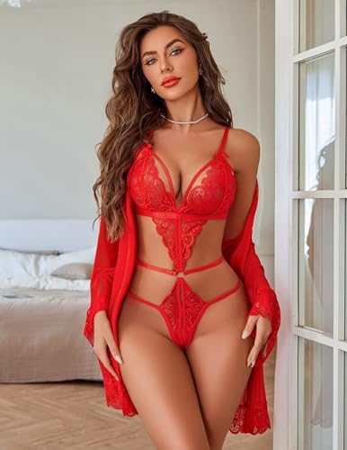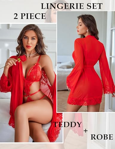 Avidlove Women Sexy Lingerie Set 2 Piece Lace Teddy with Mesh Kimono Robe Bodysuit Nightgown