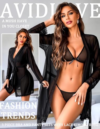 Avidlove Women Sexy Lingerie Set 3 Piece Mesh Kimono Robe with Bra and Panty Sheer Sleepwear