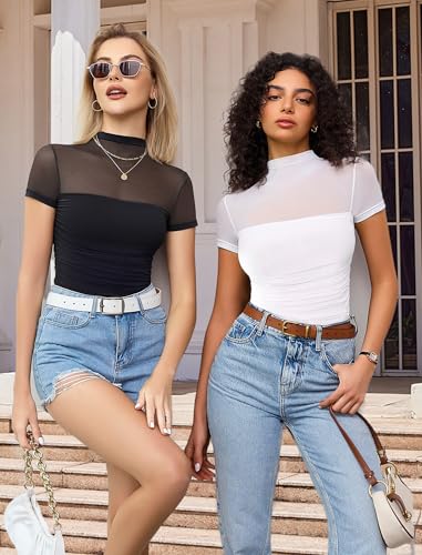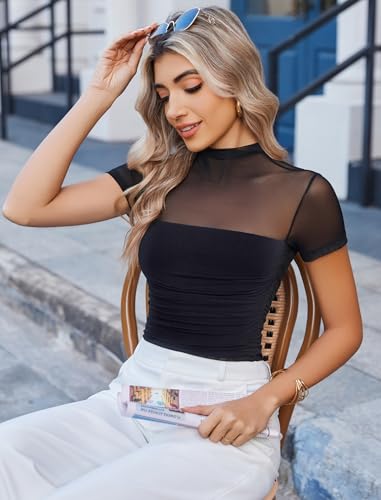 Avidlove Women's Short Sleeve Bodysuit Turtle Neck Body Suits Mesh One Piece Leotard Going Out Tops Date Outfits