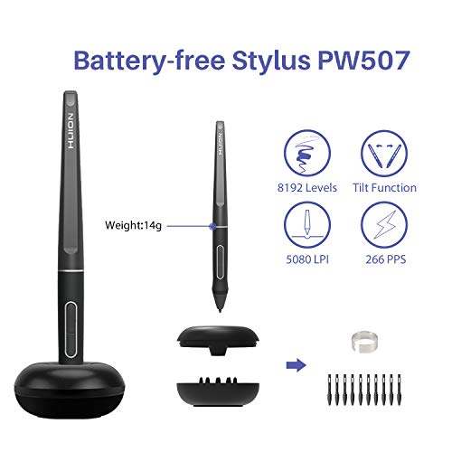 Battery-free Stylus with 60??Tilt: Battery-free pen PW507 with 8192 pressure sensitivity and latest 60?? tilt function, which could ensure accuracy as well as a natural transition between each line; The industry-leading 266PPS report rate offers you smooth drawing without any lag