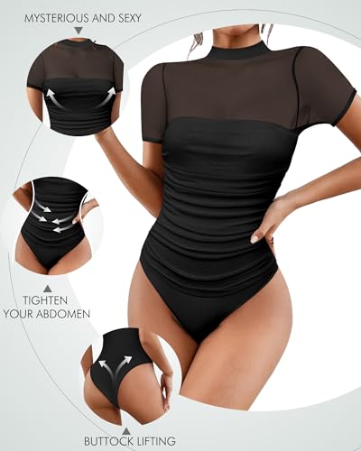 Women's Mesh Sexy Mock TurtleNeck Bodysuits Short Sleeve Shirt Ruched Sheer Body suit Summer Trendy Going Out Tops