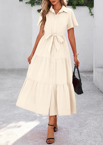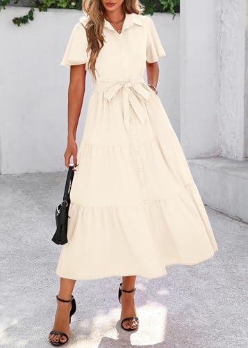 KIRUNDO Summer Button Down Wedding Guest Shirt Dresses for Women Maxi Flutter Short Sleeve Flowy Tiered Beach Sun Dress