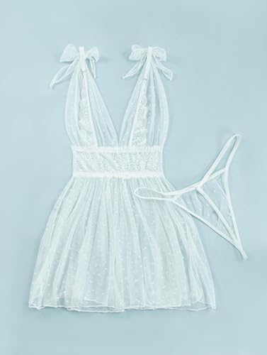 Lilosy Sexy Polka Dots Mesh Sheer Lace Babydoll Chemise Lingerie Set Floral Lace Sleep Wear