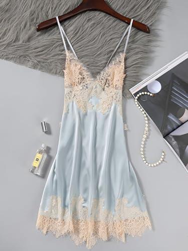 Lilosy Sexy Silk Lace Up Backless Satin Applique Floral Lace Babydoll Lingerie Dress with Tong 2 Piece