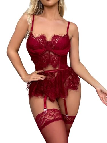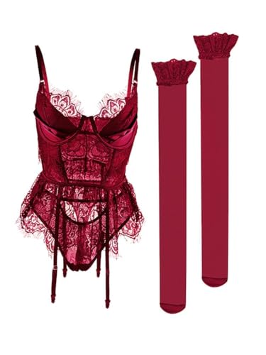 Lilosy Sexy Stocking Underwire Babydoll Lace Mesh Garter Lingerie Set with Panty 4 Piece