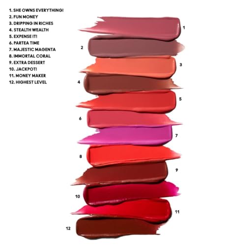 INCLUDES: 12 Mini Lustreglass Lipsticks in shades Stealth Wealth, Drippin In Riches, She Owns Everything!, Fun Money, Immortal Coral, Majestic Magenta, Par-Tea Time, Expense It!, Highest Level, Money Maker, Jackpot!, and Extra Dessert (0.05 oz / 1.5 g each).