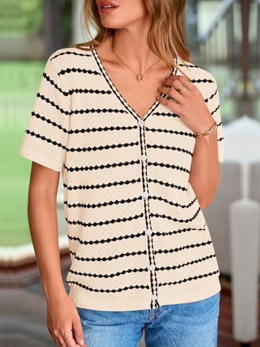 NALANISA Women's Short Sleeve Sweater Spring Summer Crochet Knit Tops 2025 V Neck Striped Button Down Dressy Casual Blouses