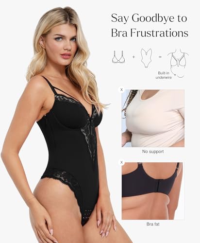 Popilush Body Suits for Womens Tummy Control Corset Lace V Neck Compression Bodysuit Underwired Side Zipper Party
