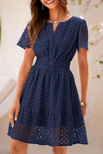PRETTYGARDEN 2025 Women Summer Short Dress V Neck Short Sleeve A Line Hollow Out Lace Ruffle Cute Casual Beach Party Dresses