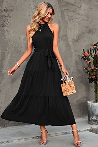 PRETTYGARDEN Women's Summer Floral Maxi Sun Dress Sleeveless Halter Neck Flowy Ruffle Hem Long Boho Dresses with Belt