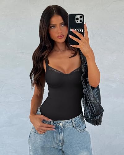 REORIA Lace Trim Tank Top Bodysuit for Women Sleeveless Square Neck Sexy Thong Bodysuit Going Out Bustier Holiday Club Tops