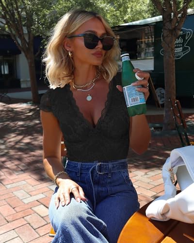 Saslax Women's Sexy Deep V Neck Short Sleeve Lace Bodysuit Double Lined Body Suit Thong Going Out Tank Tops