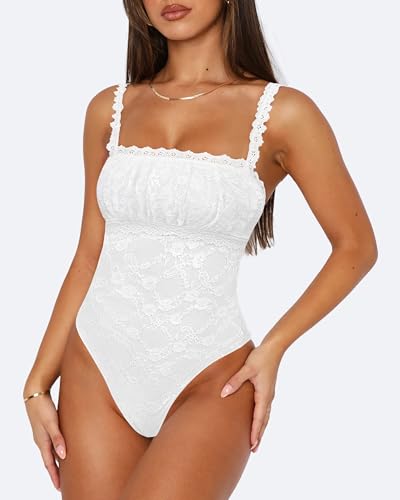 Saslax Women's Sexy Square Neck Lace Sleeveless Bodysuit Tank Tops Double Lined Body Suit Thong Outfits
