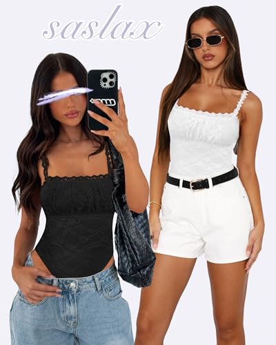 Saslax Women's Sexy Square Neck Lace Sleeveless Bodysuit Tank Tops Double Lined Body Suit Thong Outfits