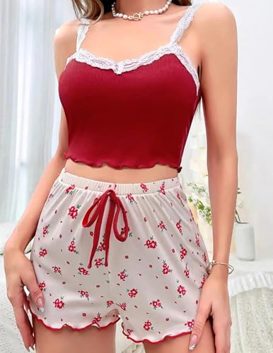 Sexy Pajama Set for Women 2 Piece lounge Set Floral Cami and Shorts Lingerie Set Cute Pjs Lace Trim Sleepwear