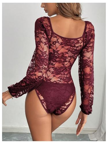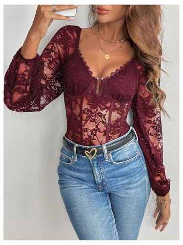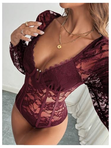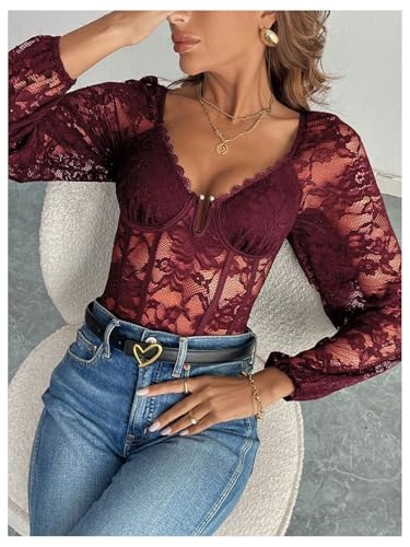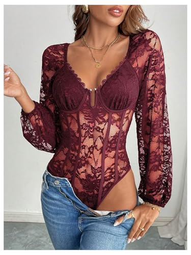 SweatyRocks Women's Lace Long Sleeve Corset Bodysuit Tops Sheer Mesh V neck Jumpsuit