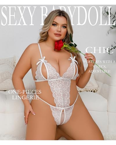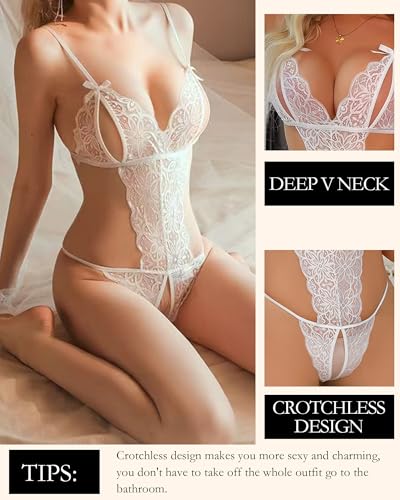 Women's Sexy Lace Lingerie Bodysuit - Adjustable Halter One-Piece Teddy Lingerie Crotchless with Sheer Mesh