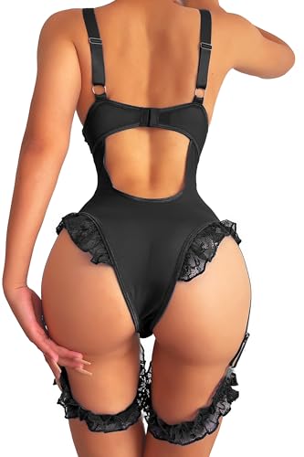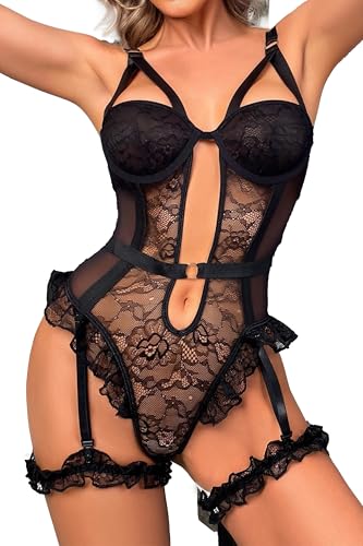 Women's Sexy Underwire 2 Piece Lingerie Floral Lace Teddy V Neck Push UP Bra and Garter