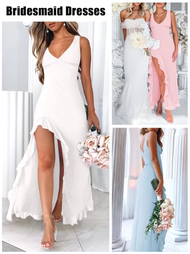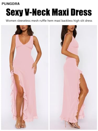 Women's Sexy V Neck Mesh Ruffles Hem High Slit Bodycon Maxi Dress for Women Formal Cocktail Wedding Guest Dresses