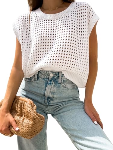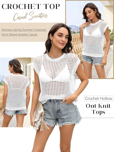 Womens Summer Crochet Tops Hollow Out Cap Sleeve Cover Up Tank Top Pullover Sweater Vest Beach Vacation Clothes