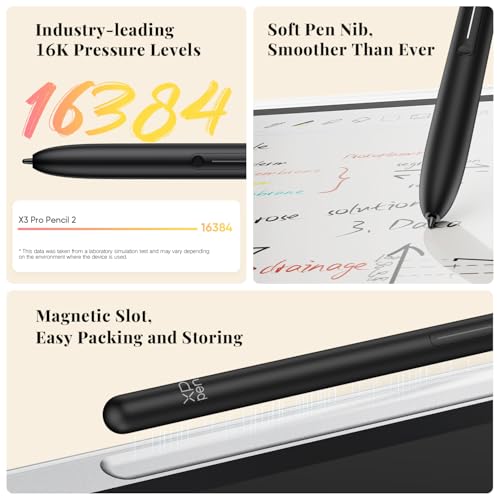 Pencil Upgraded for Noting: The XPPen electronic note-taking tablet is powered by the X3 Pro smart chip, the X3 Pro Pencil 2 features 16K sensitivity and a soft pen nib, which help you achieve varied annotation effects in both stroke thickness and color depth based on writing pressure, making your key content stand out at a glance. The magnetic suction and customized shortcut key enhance your productivity and convenience
