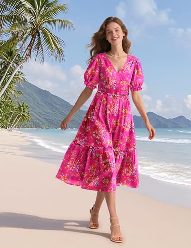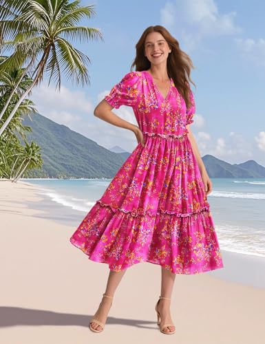 YESNO Summer Floral Midi Dresses for Women V Neck Puff Short Sleeve Frill Trim Dress with Pockets EVX