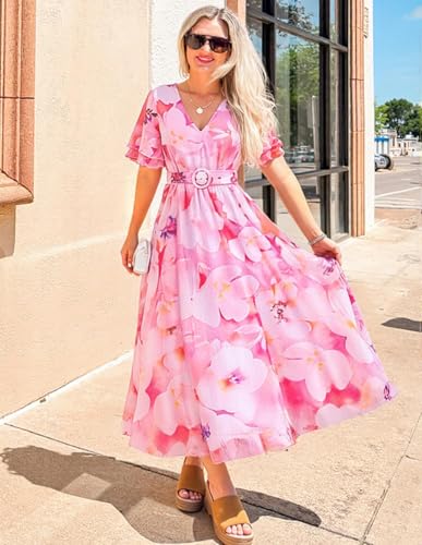 ZESICA Women's 2025 Summer Floral V Neck Midi Dress Boho Short Sleeve High Waist Flowy Beach Vacation Dresses with Belt