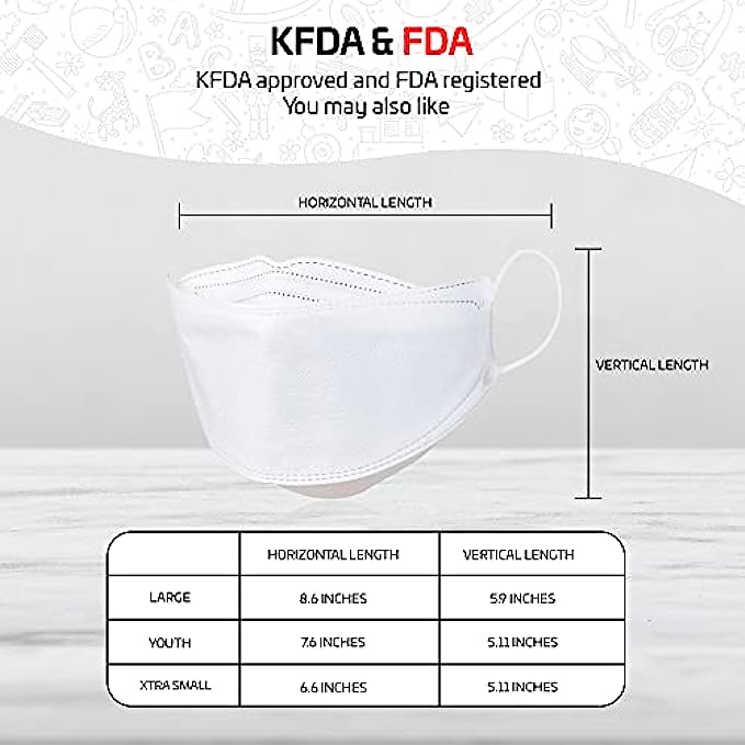 Korean High Quality Filter Non-Woven Material Made in Korea and Imported Adjustable closure ✅ BEST KIDS PROTECTION – This Extra Small KF94 disposable face mask is made with high quality MB fabric that is effective. Made with a triple-layered electrostatic filtration system, this product will filter at least 94% of PM2.5 to protect the wearer from exposure to harmful dust. This children's mask is very effective in protecting from dust, air pollution, and more. Protect your children’s health with these disposable face masks for kids. ✅ EASY BREATHING : GoodDay KF94 kids face masks fit securely on your face so that you can breath easily and keep the mask on all day without discomfort. ✅ COMFORTABLE FORM FITTING DESIGN : GoodDay kids disposable face masks have a 3D flat-fold(tri-fold) design that prevents air leakage. Use the nose bridge The adjustable nose bridge helps to ensure a secure fit and stays on your face without slipping or falling off. The perfect fit prevents fogging up your glasses. ✅ EVERYDAY USE & BACK TO SCHOOL: This Kids Mask is suitable for school, shopping, cycling, camping, running, travel, climbing and daily use. This mask will be your children's favorite mask providing them with a comfortable and cute design! ✅ KFDA APPROVED: GoodDay safety kids masks are manufactured in South Korea. The masks are KFDA approved.