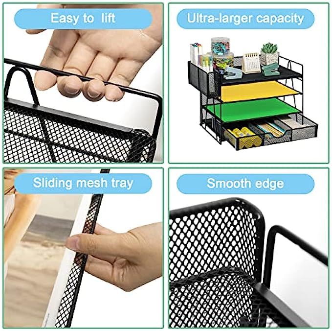 【Unique Mesh Desk Organizer】 This desk organizers you can organize printed paper, letters, statements, folders, documents, magazines, desk accessories. Desktop file organizer with 4 stackable trays and 1 sliding drawer + a pen holder divided in two.This desk organizer is the highest end of office organization design.