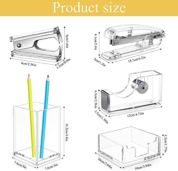 • Detailed Sizes: the clear desk supplies are measured manually, the pen holder is about 10 x 6.5 x 6.5 cm/ 4 x 2.6 x 2.6 inches, the notepad holder is about 10 x 10 x 4.5 cm/ 3.9 x 3.9 x 1.7 inches, the stapler is about 5.25 inches in length, the tape dispenser is about 4.75 long and the staple remover is about 2.36 inches long, suitable for placing on the desk