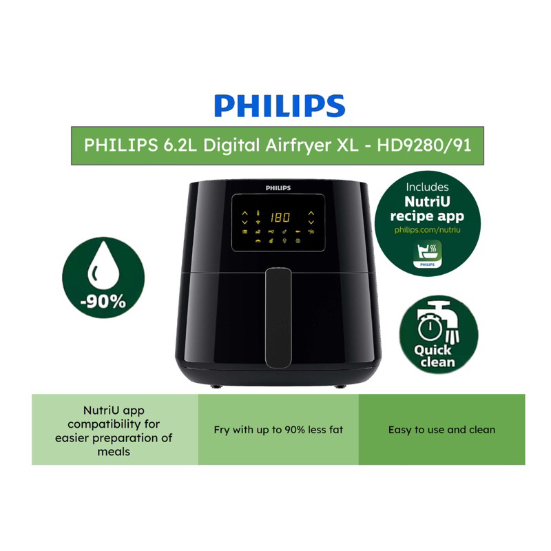 PHILIPS 6.2L Digital Airfryer XL (Essential) 12-in-1 HD9280/91 - Connectivity, Rapid Air, Quick Clean basket, NutriU App
