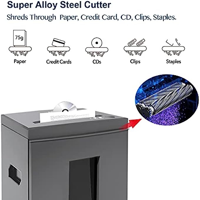 • CROSS-CUT SECURITY LEVEL P-4 to secure confidential information. Shreds max 18-sheet paper/staples/clips into particles measuring 5/32" x 1-3/8" (4mm x 35mm); also shreds CD and Credit Card. The blades will cut each disc into three pieces