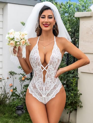 Aranmei Sexy Lingerie for Women Lace Teddy Bodysuit Deep V Cut Out Matching Panty Underwear