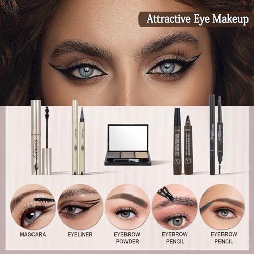 ??All In One Makeup Set??A perfect starter makeup kit that includes eyeshadow palette, loose powder, lipgloss, lipstick, concealer cream, makeup brush, concealer palette, eyebrow powder, high-gloss lying silkworm brightening powder, concealer, eyeliner, lip balm, mascara, foundation, powder puff, travel bag. All women's essentials in one elegant box and a great gift for any occasion.