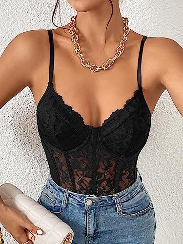 COZYEASE Women's Lace Bustier Cami Bodysuit Plain Sleeveless Slim Fit Sheer Mesh Corset Top Romper