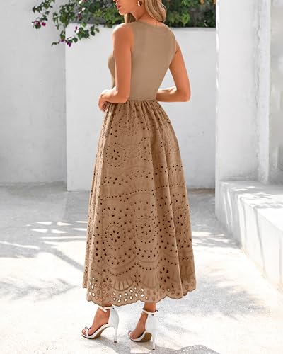 dowerme Women Summer Dresses 2025 Casual Sleeveless Crewneck A-Line Boho Lace Eyelet Cotton Tank Maxi Dress with Pockets