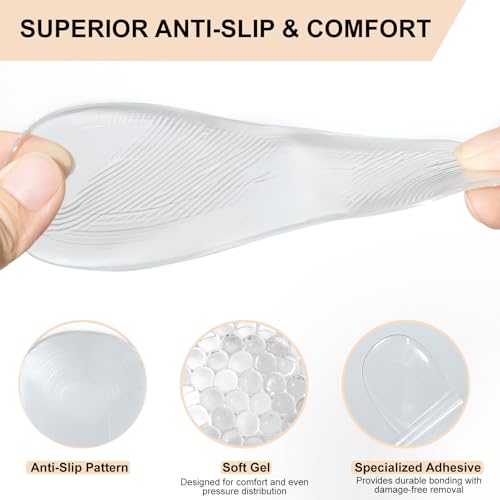 ??PLEASE NOTE??The insoles cannot be removed and transferred to other shoes. Our high heel insoles reduce the discomfort associated with wearing high heels by evenly distributing the pressure on your feet, reducing fatigue and pain. Manufactured from gel material, our insoles combine elasticity, which is soft and comfortable to wear. Before applying, peel off the plastic film on the bottom and attach it to the shoe, suitable for most high heels. We meticulously refine the solid shape of our insoles, taking into full account the natural anatomy of the foot, to make your standing more comfortable and your posture better. The top surface of the insole showcases a designed texture that increases traction, preventing your foot from sliding forward and compressing the toes.