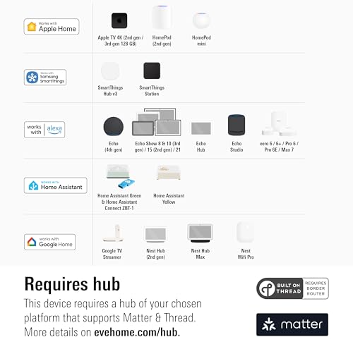 Requires iOS/iPadOS 16.4 (or later) or Android 8.1 (or later) plus a hub of your chosen platform: Apple Home: Apple TV 4K (2nd gen / 3rd gen 128 GB), HomePod (2nd gen), HomePod mini / Samsung SmartThings: SmartThings Hub v3, SmartThings Station / Amazon Alexa: Echo (4th gen), Echo Hub, Echo Plus (2nd gen), Echo Show 8 (3rd gen), Echo Show 10 (3rd gen), Echo Studio, eero 6 / 6+ / Pro 6 / Pro 6E / Max 7 / Google Home: Nest Hub (2nd gen), Nest Hub Max, Nest Wifi, Nest Wifi Pro