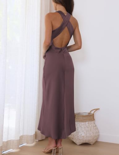 Halfisland Satin High Neck Backless Sleeveless Midi Dresses for Women Elegant Mock Neck High Waist Cross Back Cocktail Dress
