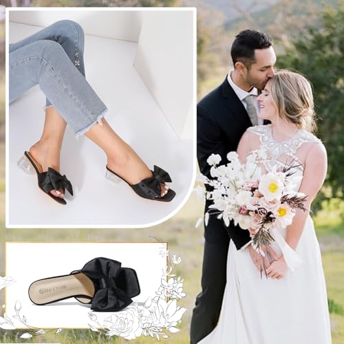 Heiyom Women's Square Toe Low Block Chunky Heels Mules Sandals Bowknot Slip on Clear Heels Wedding Bridal Party Dress Shoes