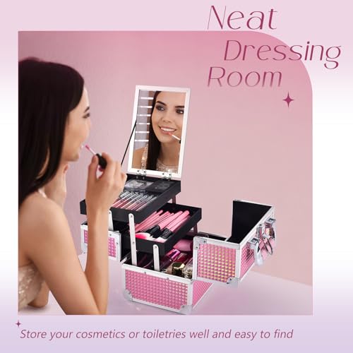 Mermaid Pink Makeup Box: Makeup box measures 9.44 x 6.69 x 7 inches, making it an ideal size for travel. Made from high-quality materials, it combines sturdy ABS aluminum with metal-reinforced corners for excellent durability. Despite its strong construction, the box is lightweight and easy to carry. Its waterproof, glittery pink surface not only looks stylish and eye-catching but also protects your makeup from moisture and other outdoor elements. The unique color subtly changes and reflects light from different angles, adding both beauty and practicality.
