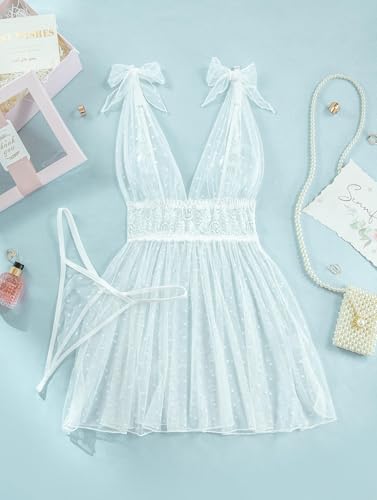 Lilosy Sexy Polka Dots Mesh Sheer Lace Babydoll Chemise Lingerie Set Floral Lace Sleep Wear