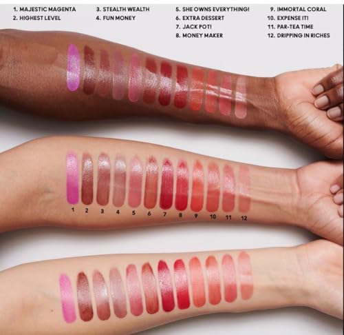 INCLUDES: 12 Mini Lustreglass Lipsticks in shades Stealth Wealth, Drippin In Riches, She Owns Everything!, Fun Money, Immortal Coral, Majestic Magenta, Par-Tea Time, Expense It!, Highest Level, Money Maker, Jackpot!, and Extra Dessert (0.05 oz / 1.5 g each).